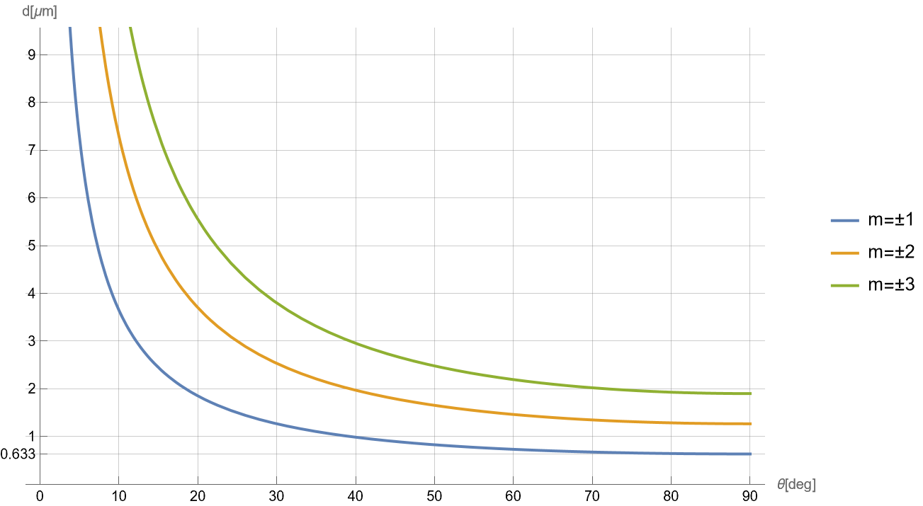 (1)に出てくる変数はそれぞれ、回折格子の溝間隔\(d\)、波長\(\lambda\)、回折次数\(m\)、回折角\(\theta\)を表す。またCGHを理解する:回折角の記事にて、\(\lambda=0.633 \mu m\)、\(m=1\)の場合の例として、回折角\(\theta\)と回折格子の溝間隔\(d\)の関係とをグラフで示した。CGHを製作する際のレーザーマスクレスリソグラフィーのPSFサイズの制限から、溝間隔は概ね\(d\sim2 \mu m\)が下限値であるため、グラフから最大回折角は\(\theta\sim18.5^{\circ}\)程度になることが読み取れた。