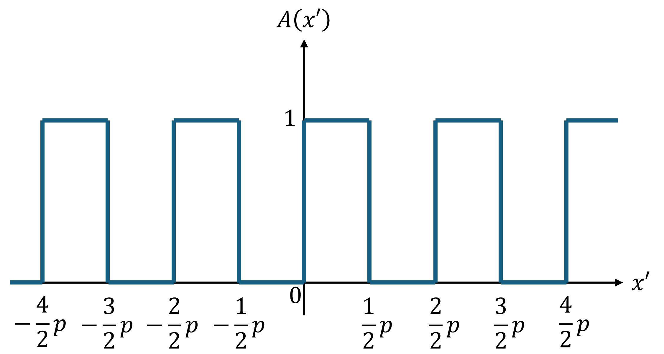 図1:1次元バイナリ振幅型グレーティングの開口面での複素振幅\(A(x’)\)(duty比\(1:1\))