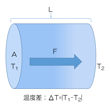 仮にいま検討している窓材が低温冷却する機器の内外を隔てる用途だとした場合、窓材の内側は冷えるものの、外側は大気環境下にてあたたかい状態が続く。もし比熱が小さい場合、窓の内側と外側で温度変化(温度順応)が簡単に起こってしまうため、内外で温度差がつき、いかに線膨張係数を考慮していたとしても、せっかく窓として活用しようとしても曇ってしまう恐れがある。そこで重要なのが物質内の熱の伝わりやすさを表す指標である、熱伝導率(Thermal conductivity、[W/m・K])と熱拡散率(thermal diffusivity、[m2/s])である。単位面積\(A\)・長さ\(L\)の物体の両端に温度差\(\Delta T\)があるとき(図1)、物体内を単位時間内に流れるエネルギー\(F\)は、